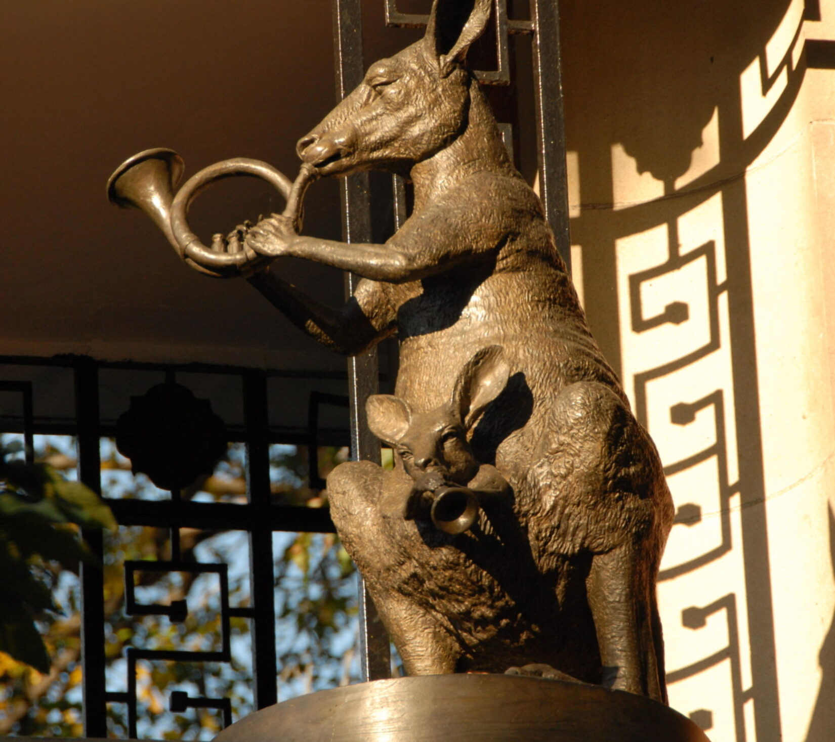 With each passing half hour, the Delacorte Clock springs to life. It features six bronze animals: a goat on the horn, a hippo on the violin, an elephant on the accordion, a penguin on the drums, a bear on the tambourine, and a kangaroo on the French horn. Each sculpture was meticulously designed by Italian sculptor Andrea Spadini, whose signature is inscribed on the base of each animal.